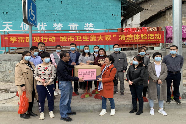 河池分公司組織志愿者到金城江街道體育館至維六村委一帶街道進行大清掃。勞動結束后,分公司向當?shù)丨h(huán)衛(wèi)站捐贈口罩2000個,向環(huán)衛(wèi)一線人員致敬。